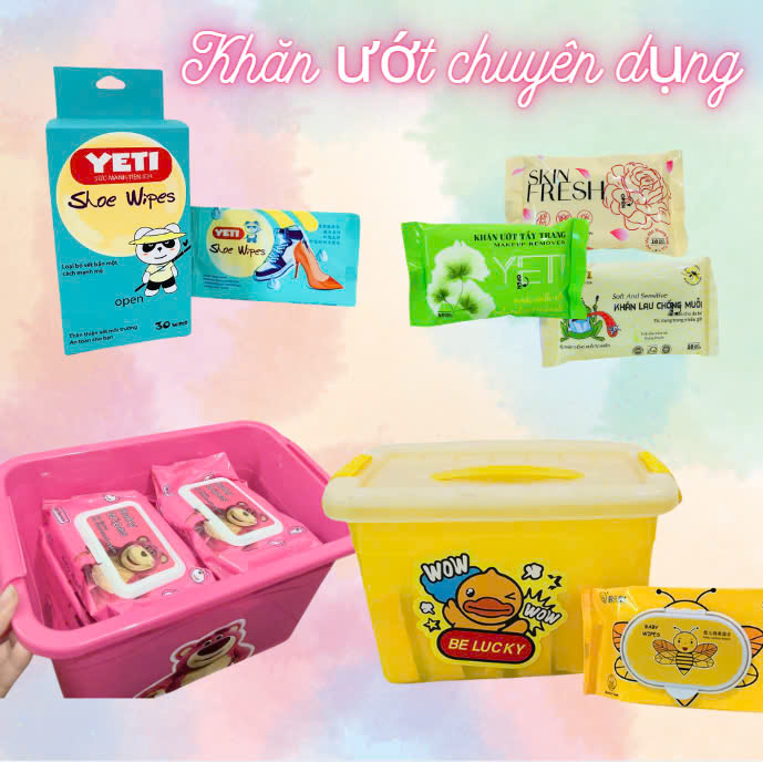 - Khăn ướt chuyên dụng: Khăn ướt lau giày, lau quần áo, khăn lau bếp, khăn lau dọn nhà cửa