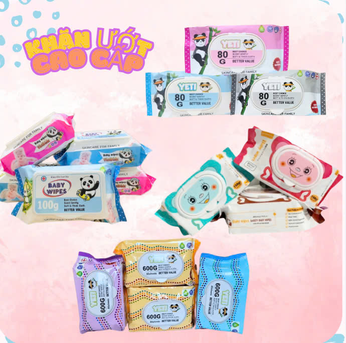 - Khăn ướt các loại: 300g, 600gam, 650gam, 80gam, 100gam: Khăn ướt tiện dụng cho mẹ và bé với đủ các chất liệu vải, kích thước, đặc tính phù hợp với các tệp khách hàng đa dạng khác nhau